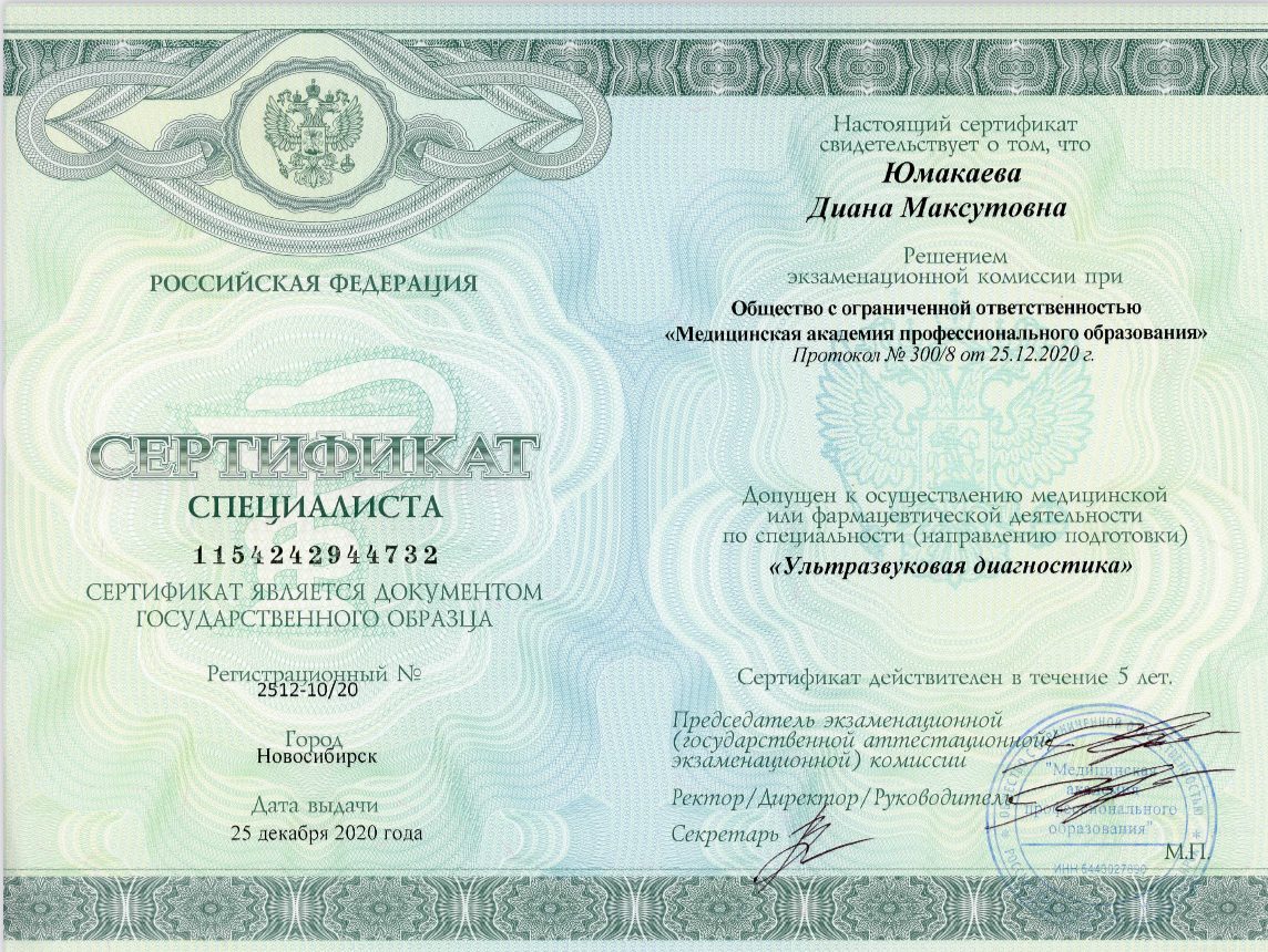 2025 г., ФГБОУ ДПО "Российская медицинская академия непрерывного профессионального образования" МЗ РФ, Ультразвуковая диагностика, №7725 033181612;
