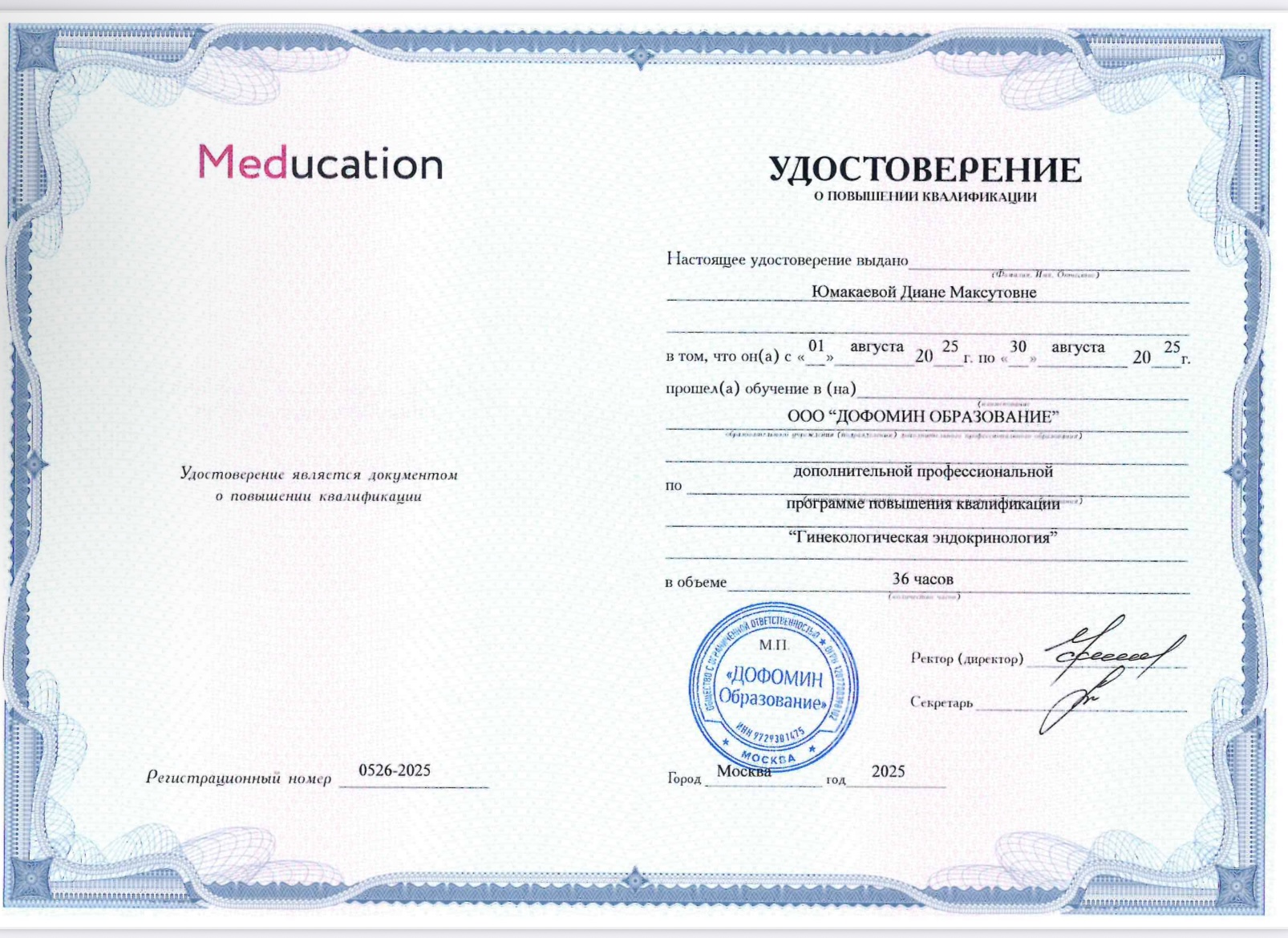 2025 г., Повышение квалификации по гинекологической эндокринологии, Mymeducation;